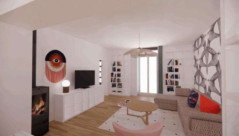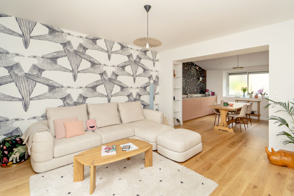 Un mur porteur a été ouvert entre cuisine et séjour pour créer une grande pièce de vie traversante. Une porte discrète permet un passage pratique vers l’entrée.