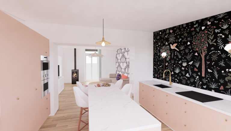 La cuisine orientée nord a été pensée dans un coloris chaud, Nude abricot, avec un papier peint végétal en crédence.