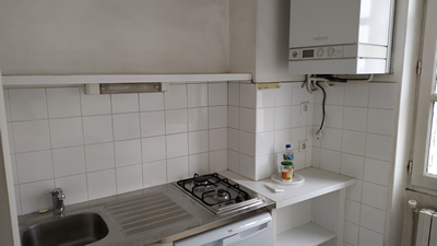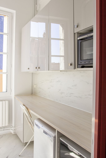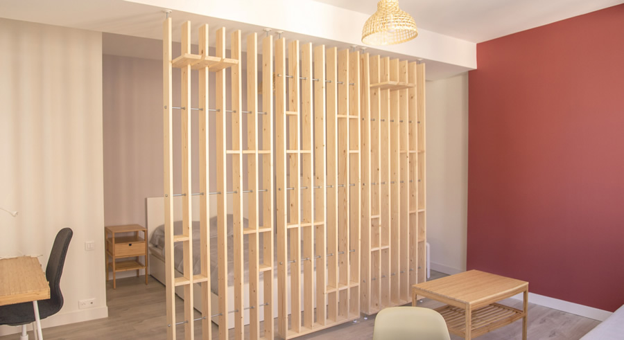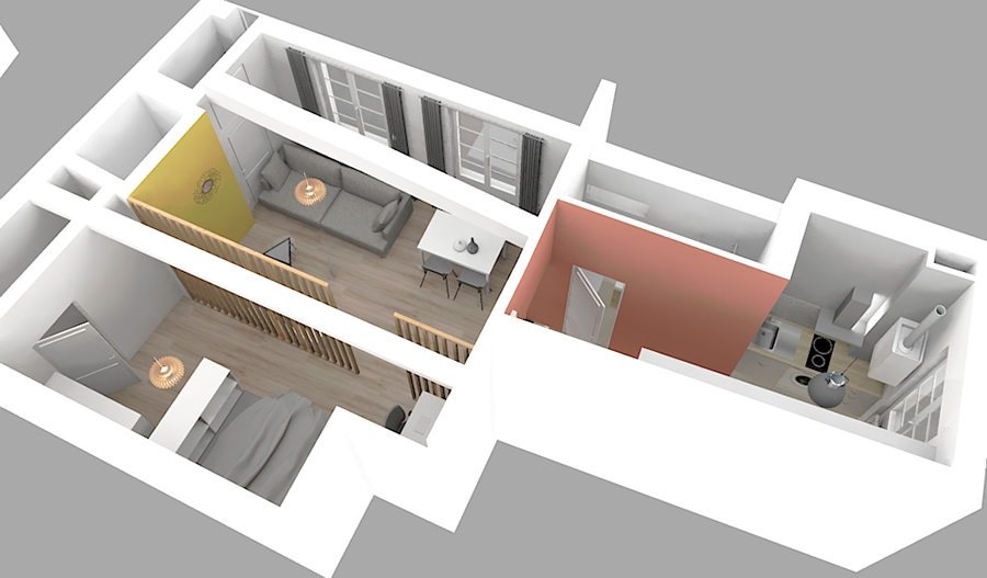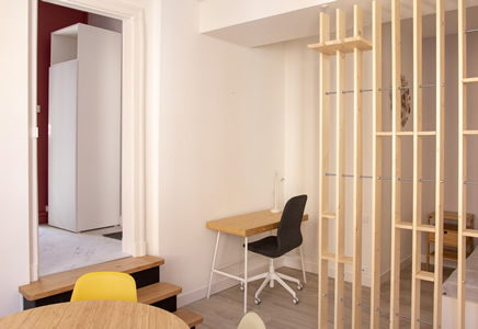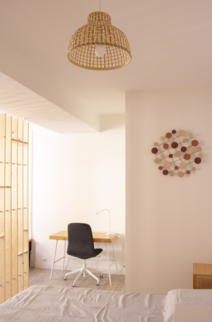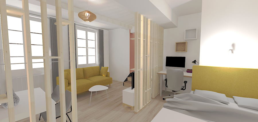 Pour cet appartement destiné à la location étudiante, le projet consiste à rénover principalement la cuisine et la salle de bain, ainsi que changer le sol de la pièce de vie et l’escalier. Cette pièce ayant un beau volume, nous avons créé un coin nuit, avec rangements et un bureau. L’aménagement a donc été travaillé sur cette partie, notamment sur la « cloison » de ce coin nuit, souhaitée ajourée.