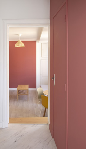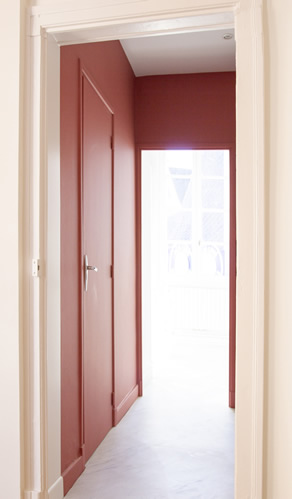 Dans l’entrée nous avons la couleur « brique » également, pour rendre l’espace chaleureux. Complété par des rangements pour l’aspect fonctionnel. La plafond initialement à 340cm de haut a été rabaissé et l’éclairage retravaillé.