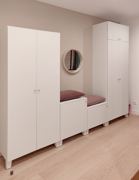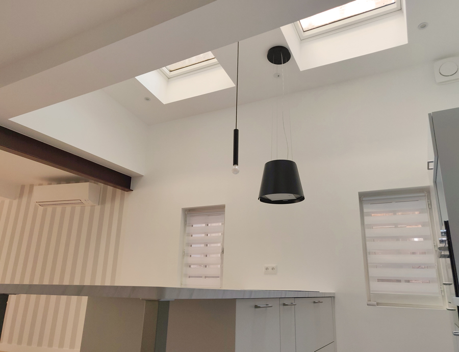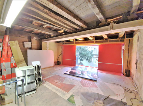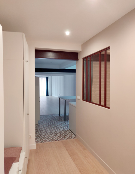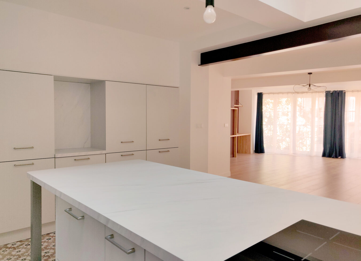 Transformation d’un plateau pour créer un appartement avec une belle pièce de vie et deux chambres. Nous avons transformé la grande baie vitrée publicitaire en un ensemble de portes-fenêtres afin d’harmoniser la façade. Des travaux d’isolation, de ventilation, création des réseaux d’électricité et plomberie ont été effectués. L’aménagement se distingue par les volumes de la pièce de vie.