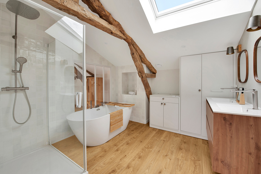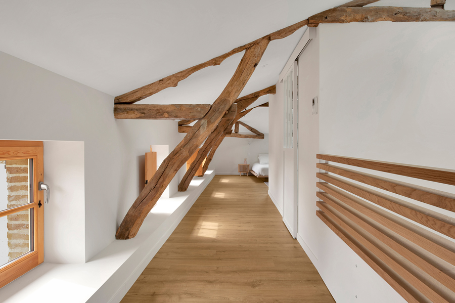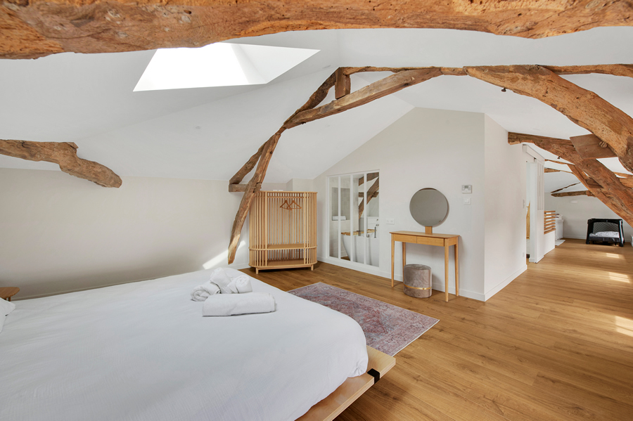 Dans ce premier gîte « Maison de Maitre » nous avons fait de gros travaux de rénovation sur l’ensemble, afin de le moderniser. Il comporte un RDC avec cuisine, pièce de vie, salon TV. Les chambres avec SDB sont à l’étage et il y a ensuite des combles aménagés en grande suite parentale.