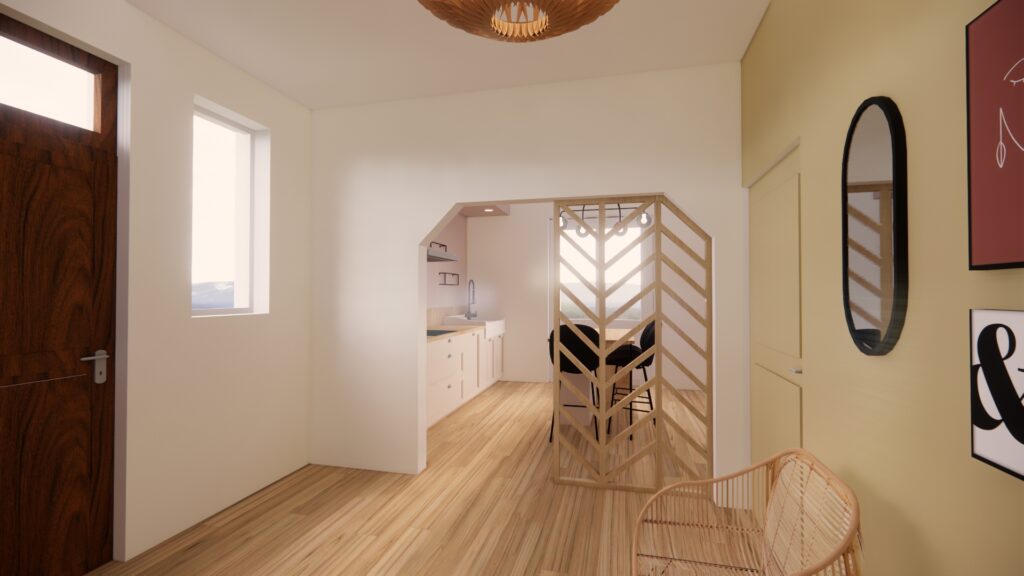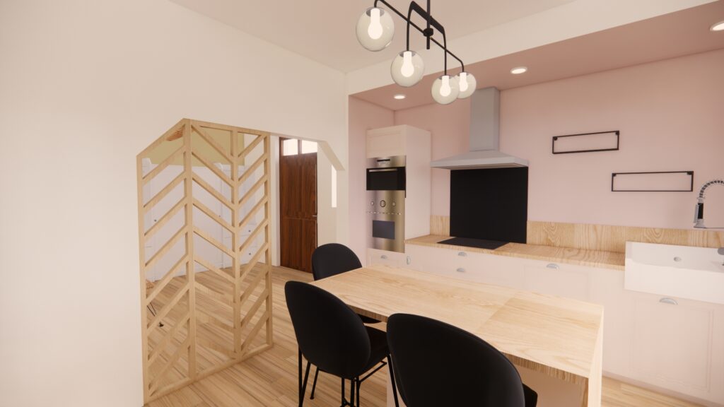 Nous avons laissé la salle à manger à son emplacement mais transformé le couloir en ajoutant une cloison au fond, pour couper des autres pièces. La forme « en biais » donne un peu de cachet, offre un maximum de surface pour la salle à manger malgré la contrainte de l’escalier menant à l’étage.