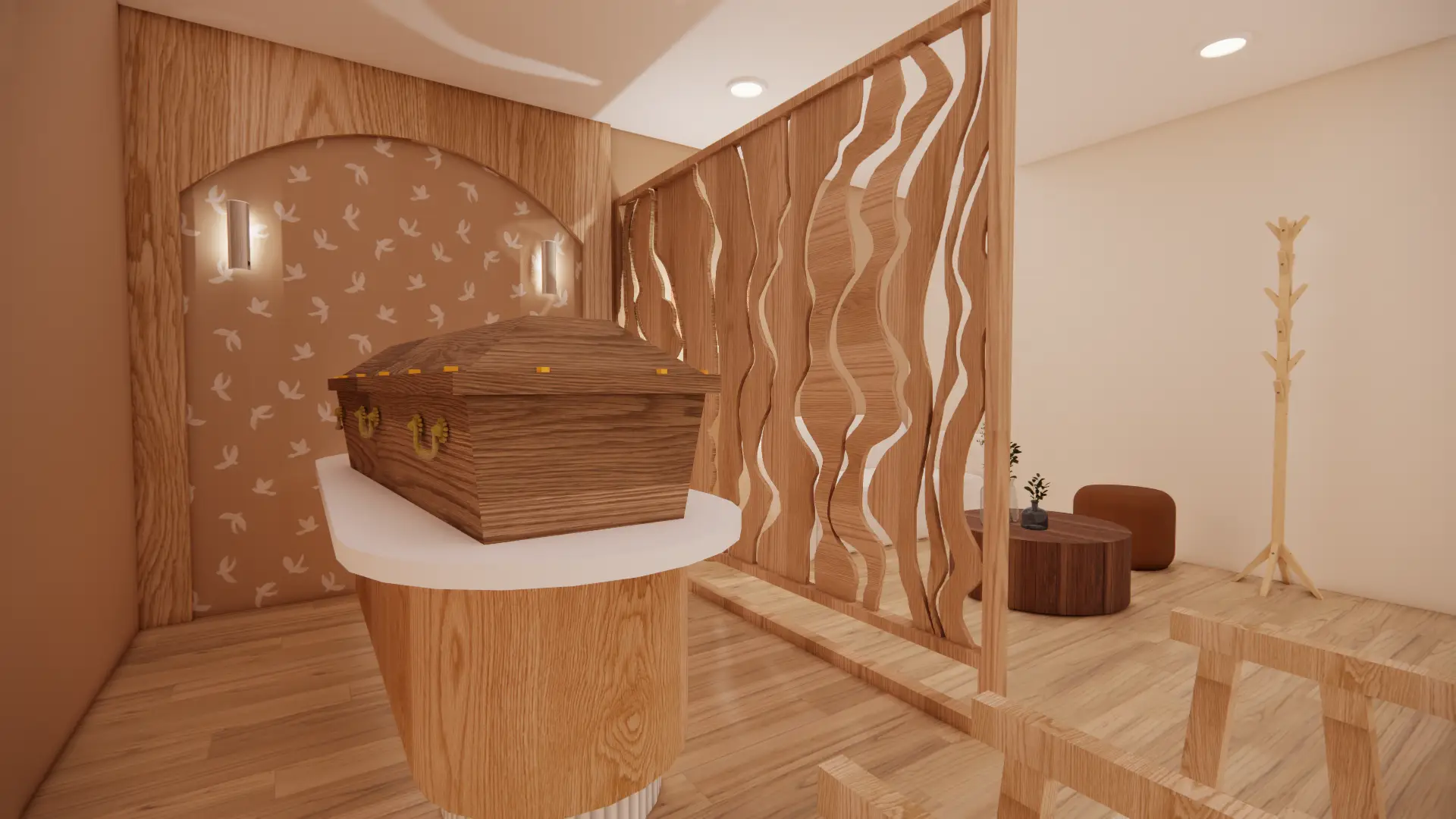 J’ai également dessiné les paravents, qui permettent de dissimuler le cercueil lors de l’entrée dans la pièce.