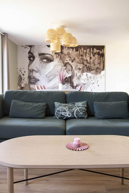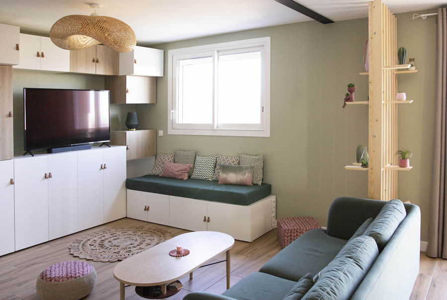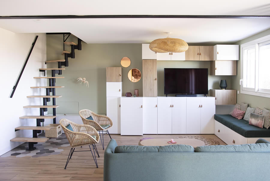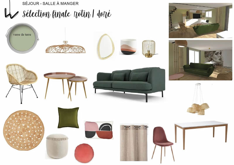 Pour la partie séjour, la couleur souhaitée étant le vert, j’ai travaillé autour de cette couleur, en déclinaison et associée à du rose pâle par touches. Nous avons aussi des matières chaleureuses, comme le velours, le lin, le rotin, le métal doré…