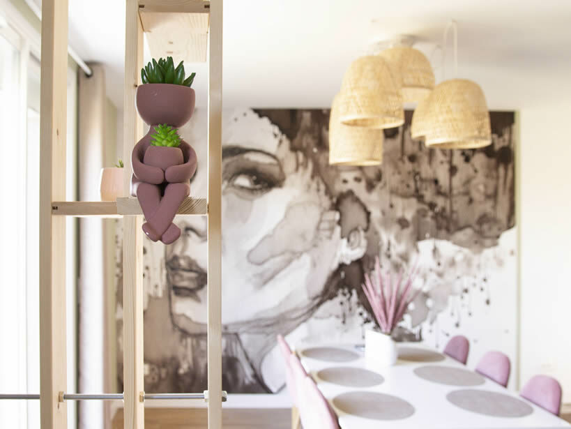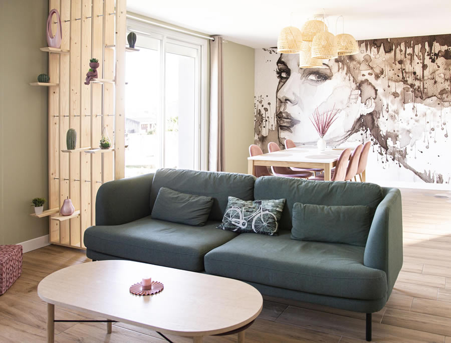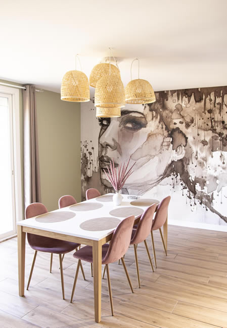 Pour la partie salle à manger nous avons choisi un papier-peint panoramique « Black Lady » qui donne une vraie personnalité à cet espace.