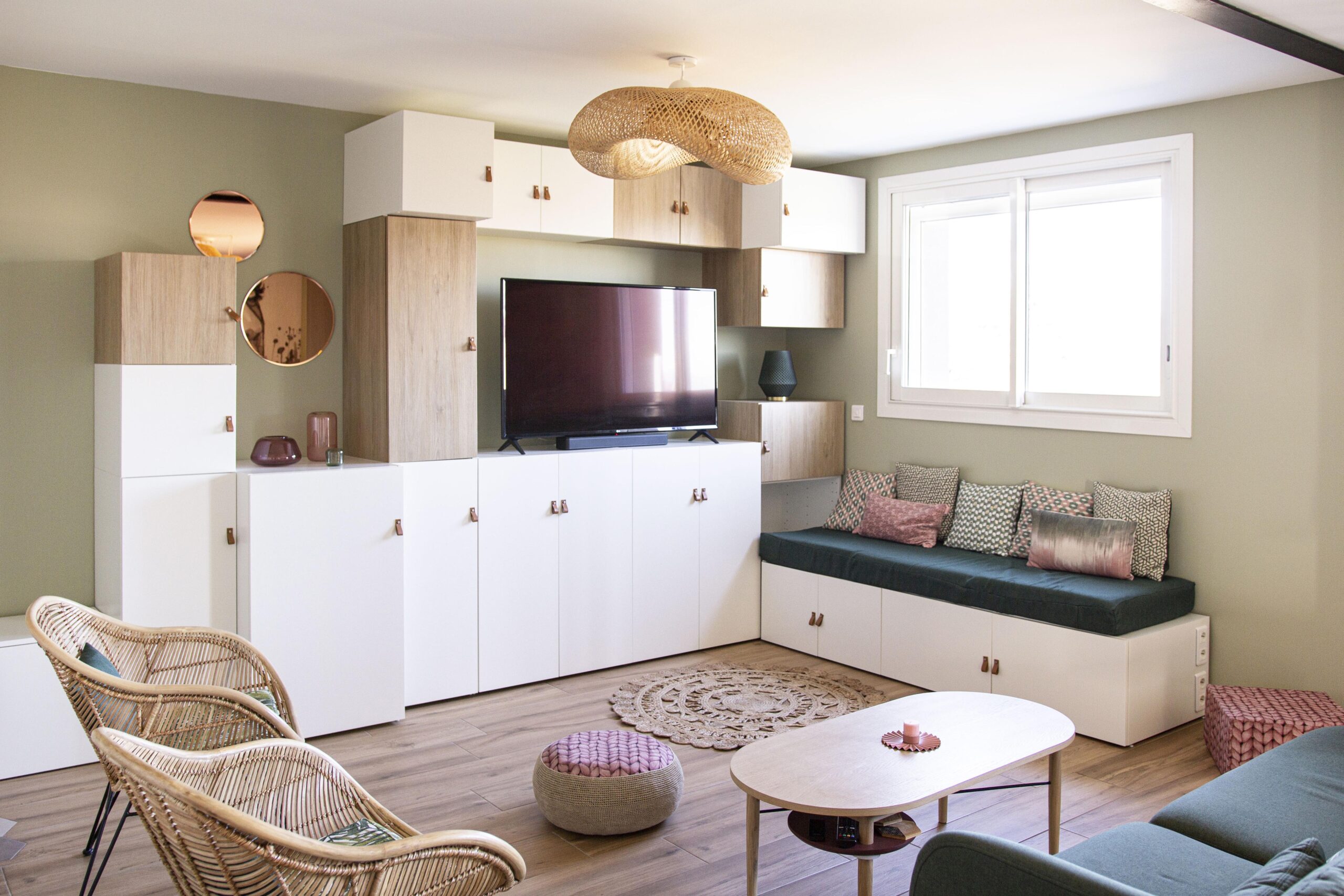 L’élément principal de la pièce devait être la conception d’un meuble sur-mesure pour la télé, avoir du rangement, intégrer un banc… Ma cliente souhaitait un style épuré, ne pas avoir trop de meubles en plus de cet élément.