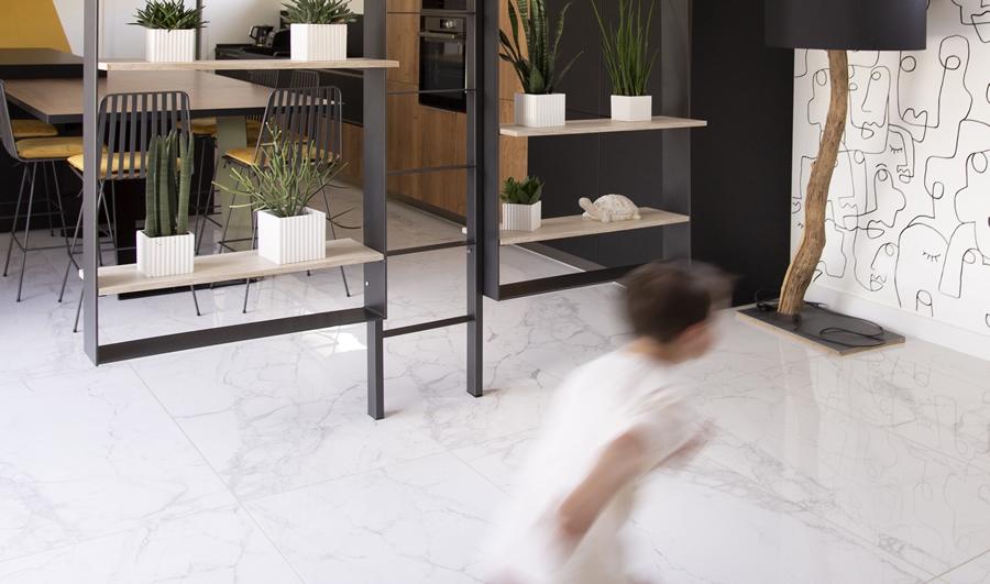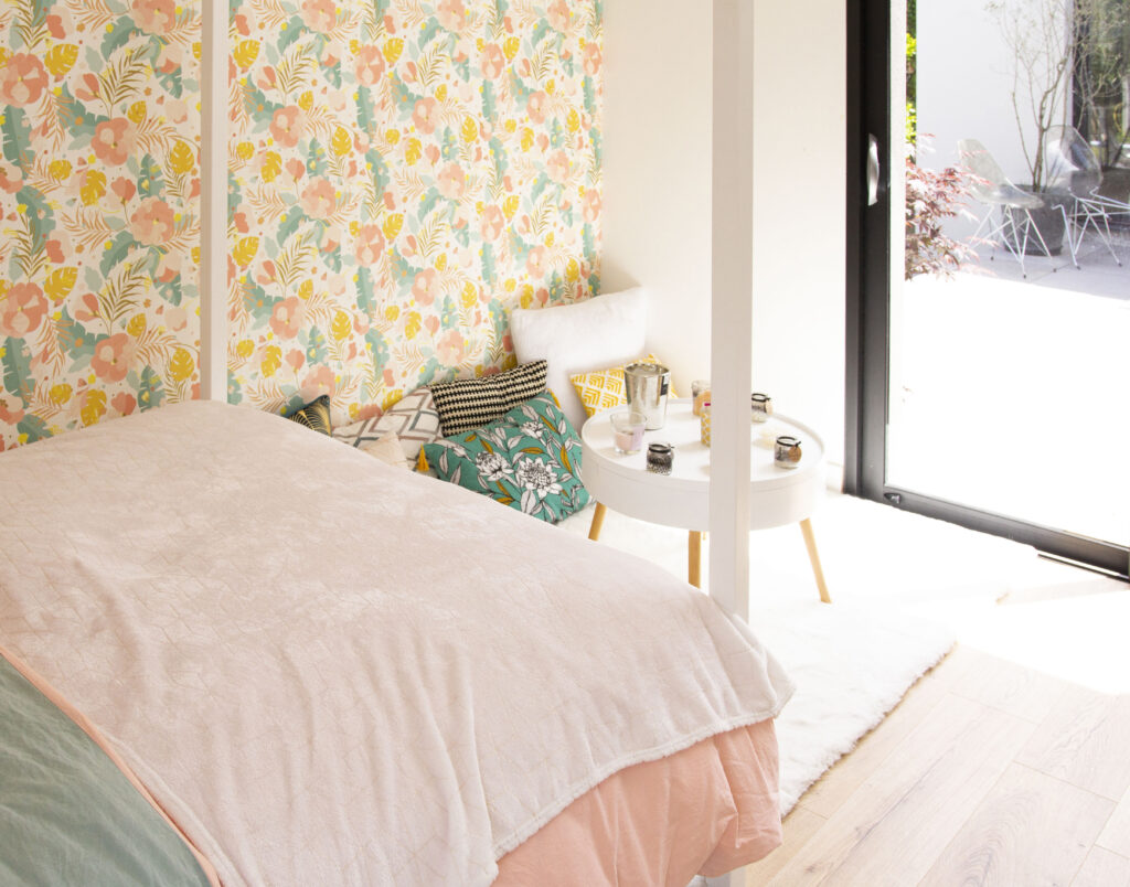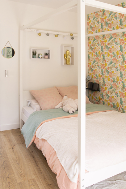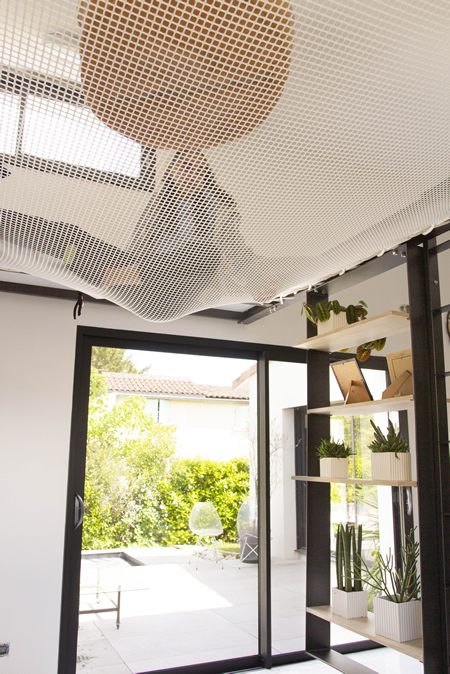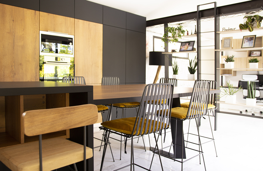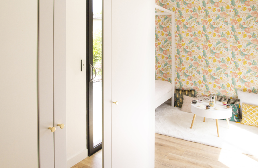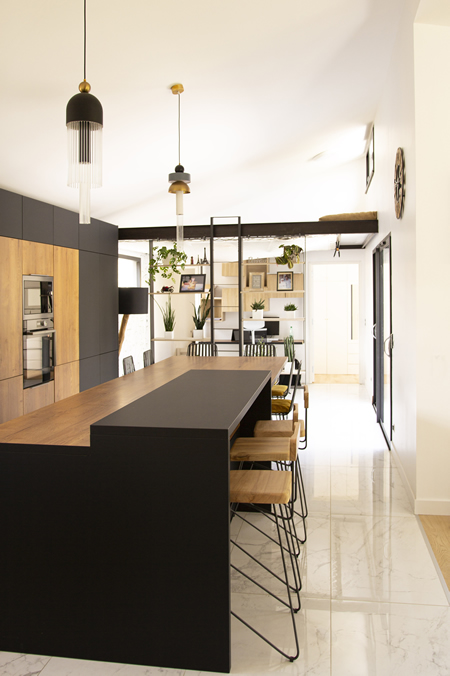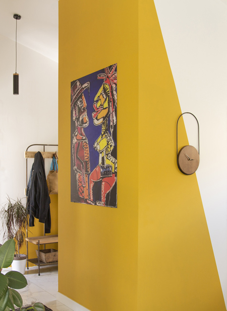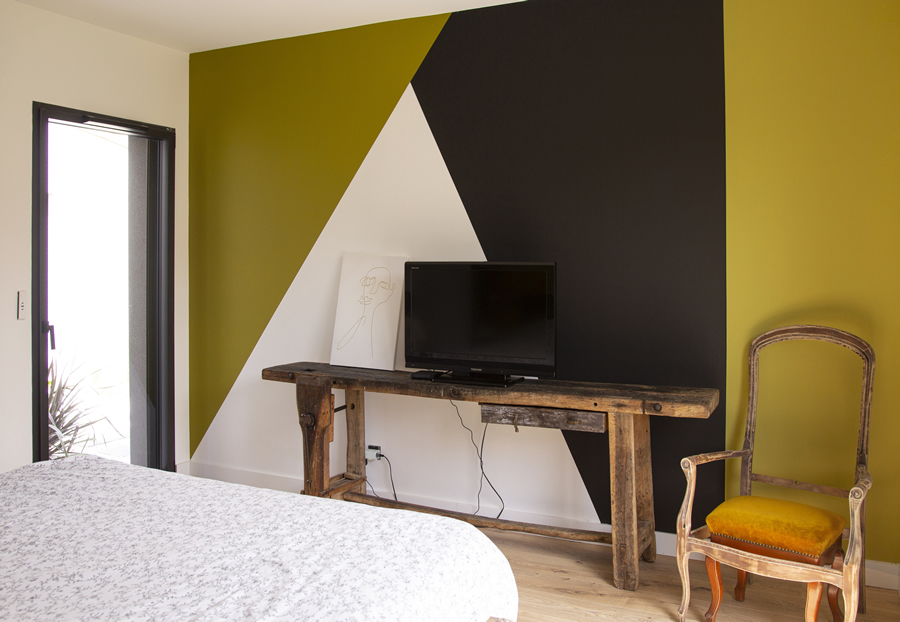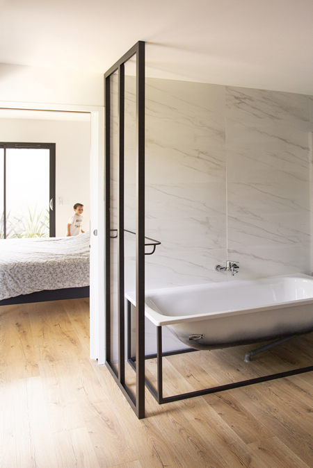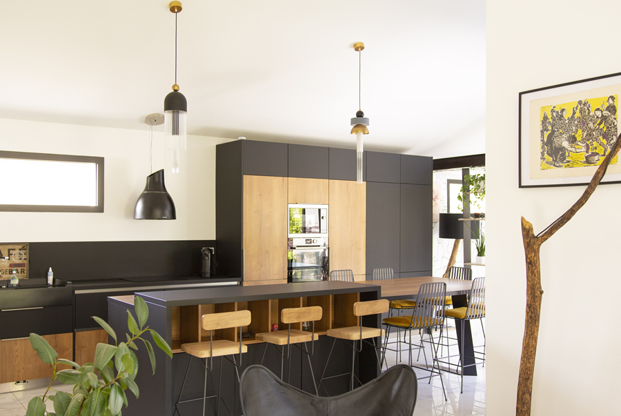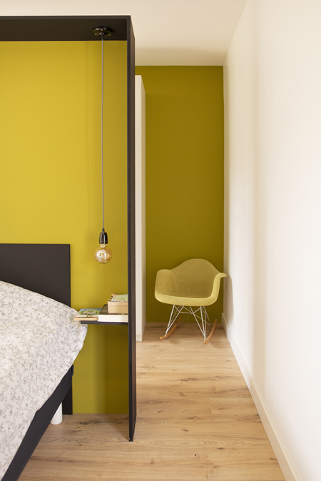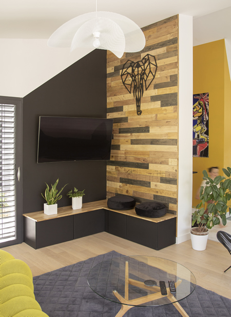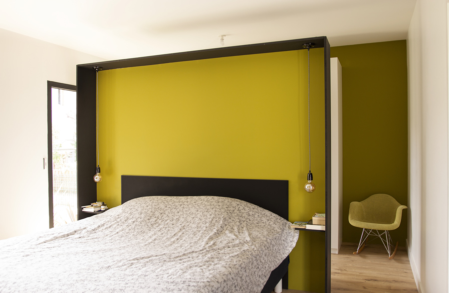 A l’intérieur, pour le mobilier et décoration, les choix sont modernes également mais aussi singuliers. Mon client a réalisé beaucoup de choses lui-même d’après mes dessins: le parement en bois, toute la structure métallique comprenant les étagères et le filet de lecture, la tête de lit de la chambre parentale… Le mobilier et la décoration se déclinent dans les couleurs et matières jaune, ocre, noir et blanc, bois, métal. Un style résolument moderne mais chaleureux.