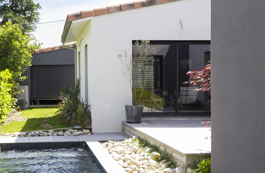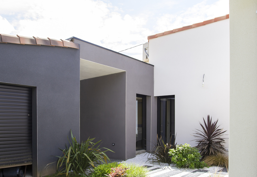 L’extérieur de la maison se veut moderne avec un jeu de toitures en pente / toitures terrasses. Une réflexion a été menée sur la liaison extérieur-intérieur avec des pièces qui donnent sur une terrasse extérieure, avec de grandes ouvertures.