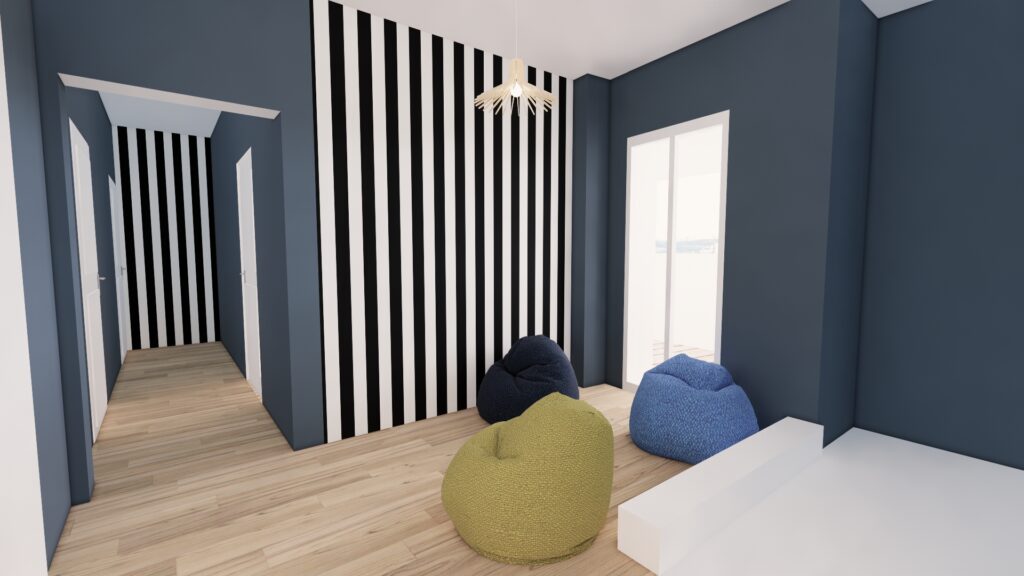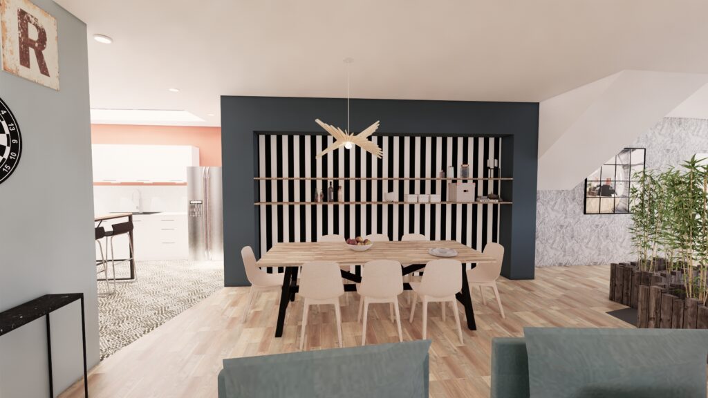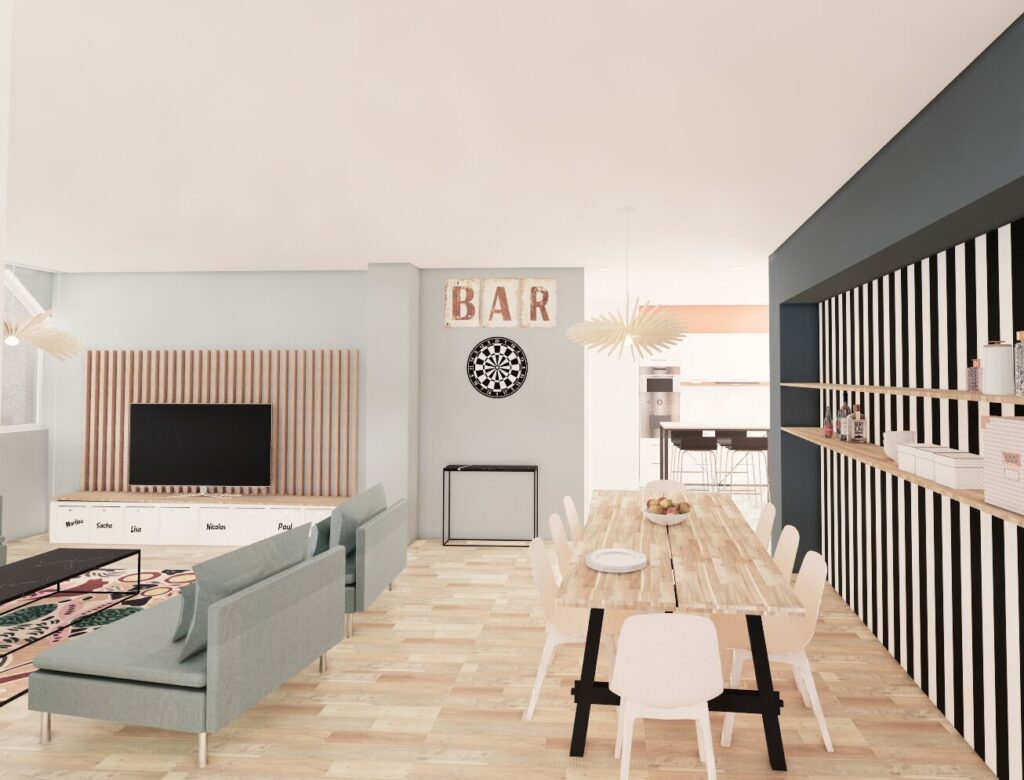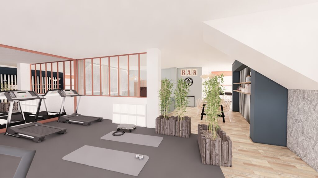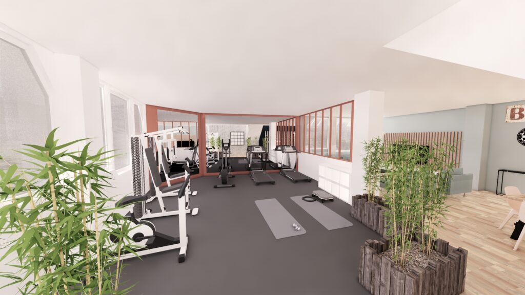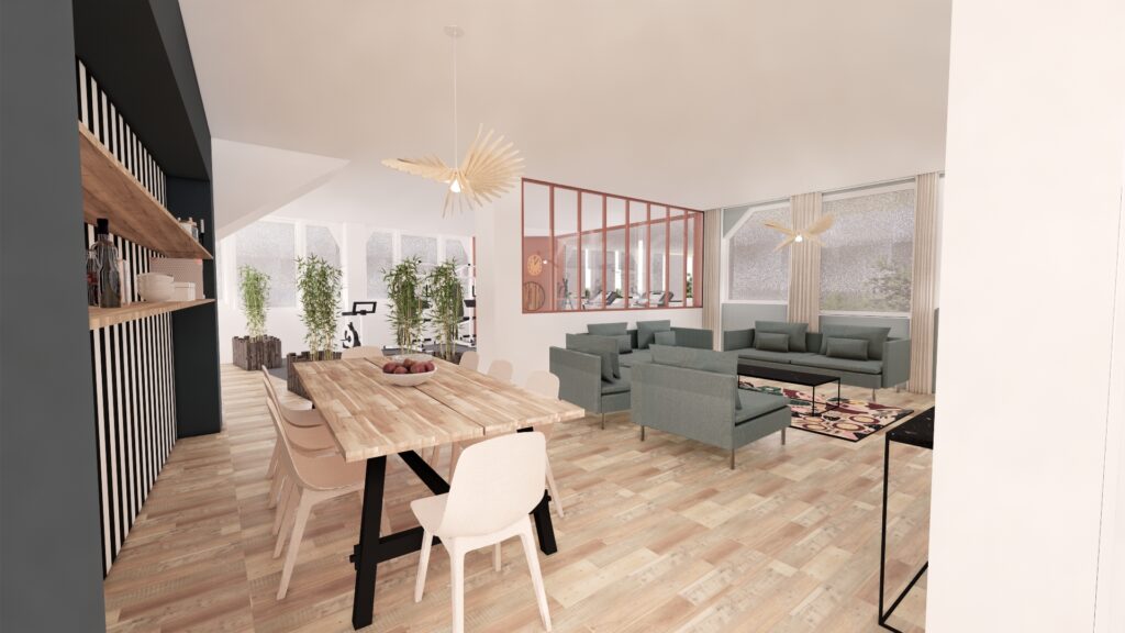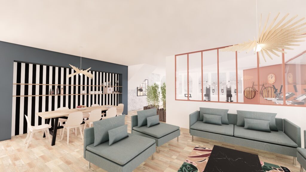 Mon client m’a contacté afin de transformer cette maison de 220m² afin d’y créer une résidence avec salle de sport, pièce de vie et cuisine communes, ainsi que 6 chambres avec leur SDE/WC privative.